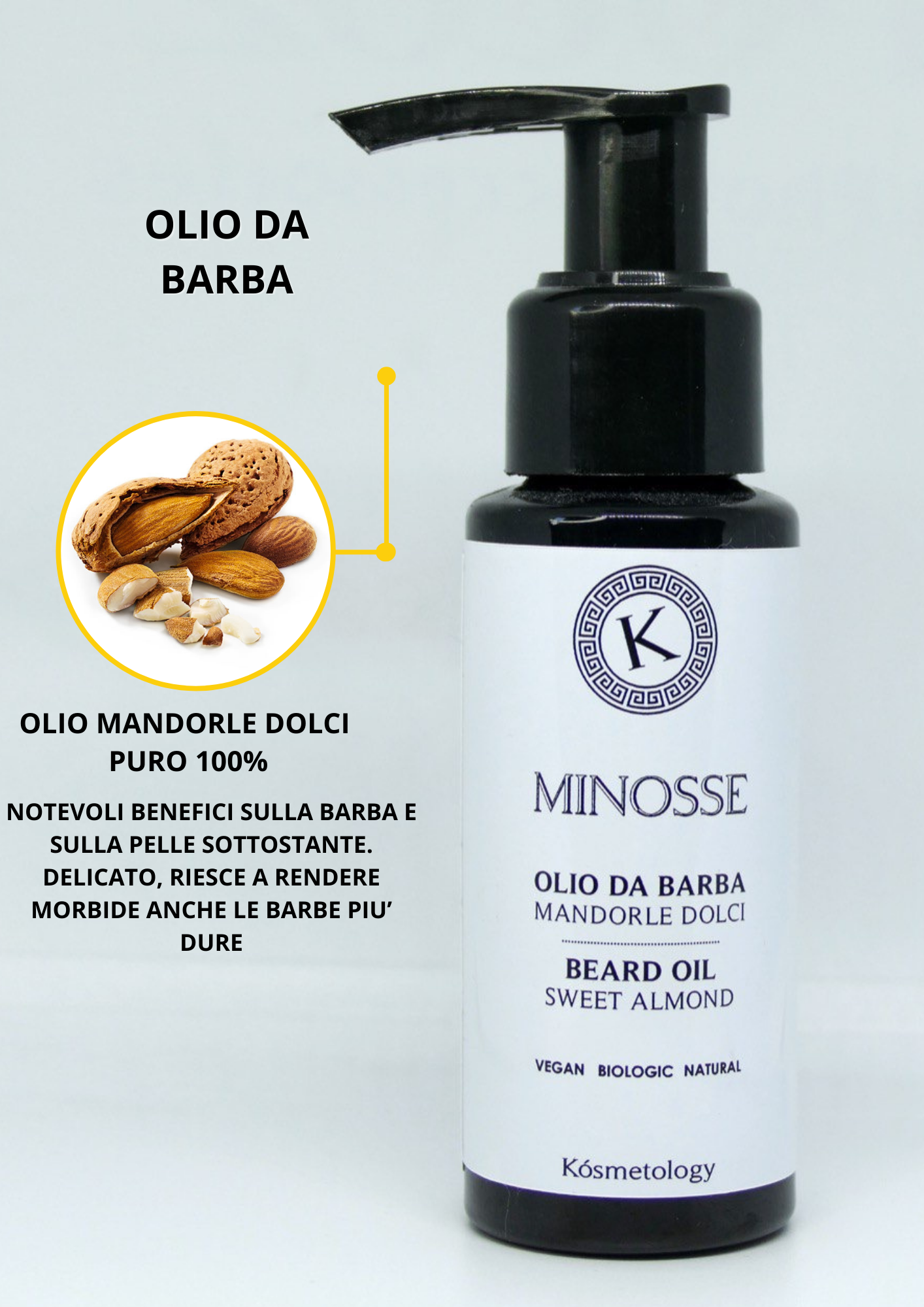 Un altro olio a cui la tua barba non può rinunciare è Minosse: composto essenzialmente da olio di mandorle dolci puro 100%, in grado di donare notevoli benefici alla tua barba e alla pelle sottostante.