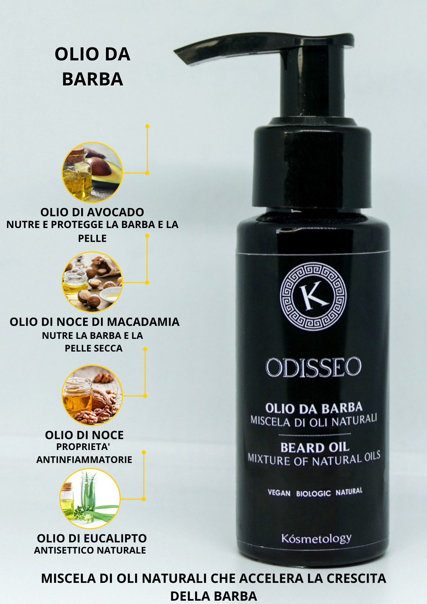 Scegli oli arricchiti di proprietà nutritive e antisettiche naturali come l’ eucalipto o l’ olio di noce, elementi primari di Odisseo.